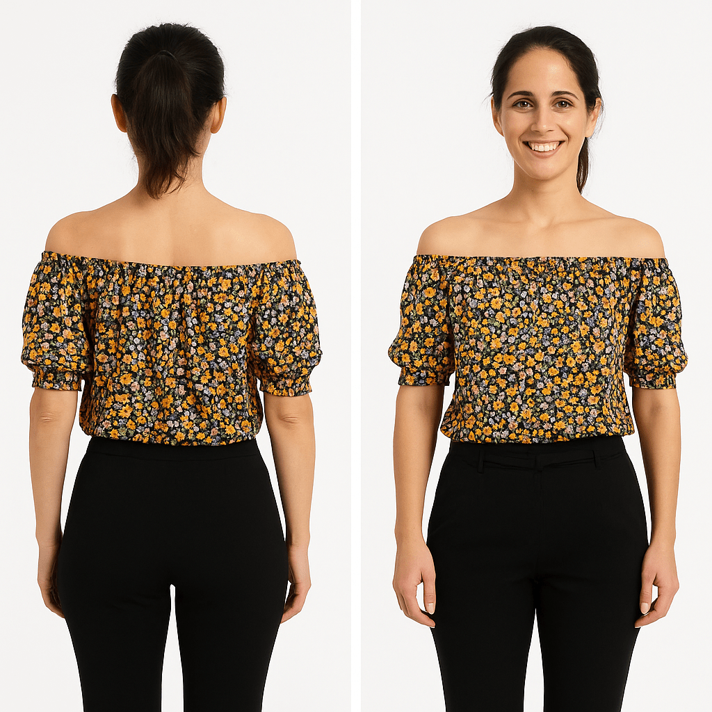 Leichte, schulterfreie Damenbluse mit wunderschönem Blumenmuster in Schwarz und Orange. Angenehm zu tragen – perfekt für Alltag, Freizeit oder besondere...