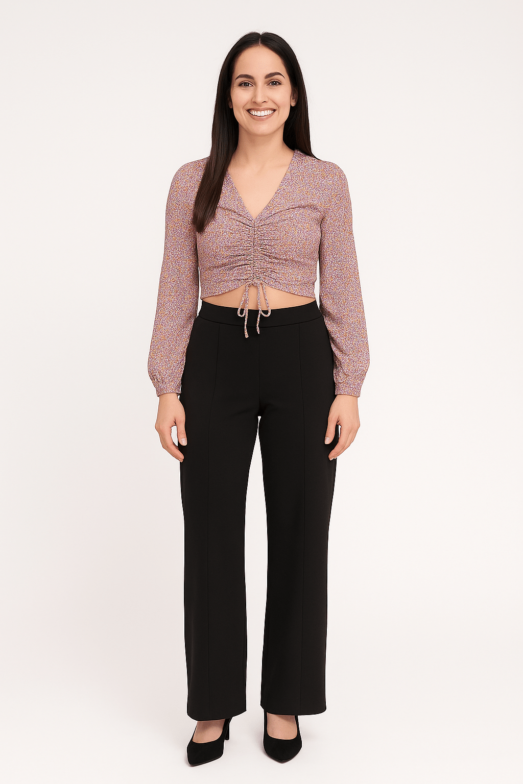 Leichte Bluse mit feinem Blumenmuster, V-Ausschnitt und verstellbarem Bindeband vorne. Weiche, feminine Passform – perfekt für Alltag oder Büro. Preis:...