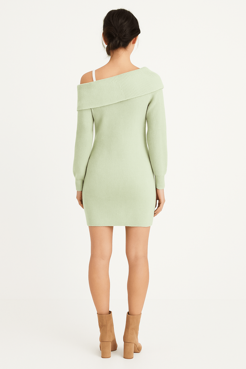 Elegantes Strickkleid von Vila in einem sanften Salbeigrün. Weicher Rippstrickstoff, figurbetonter Schnitt und ein modischer, umgeschlagener Off-Shoulder-Kragen machen dieses Kleid...